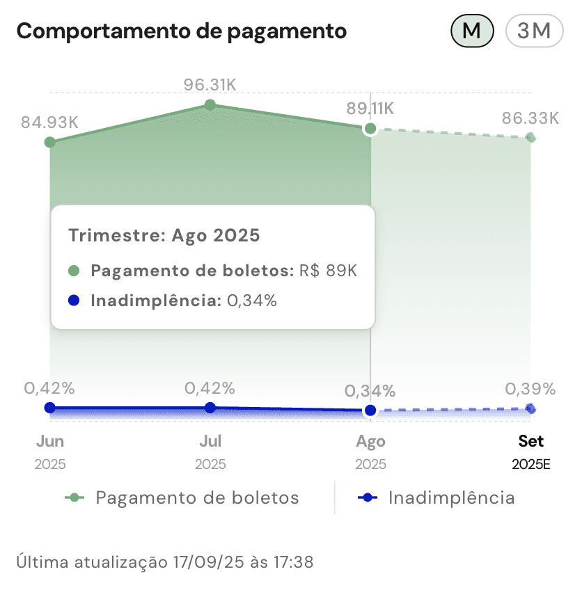 Uma visão clara da saúde financeira e da capacidade de pagamento de cada cliente, com dados atualizados em tempo real.