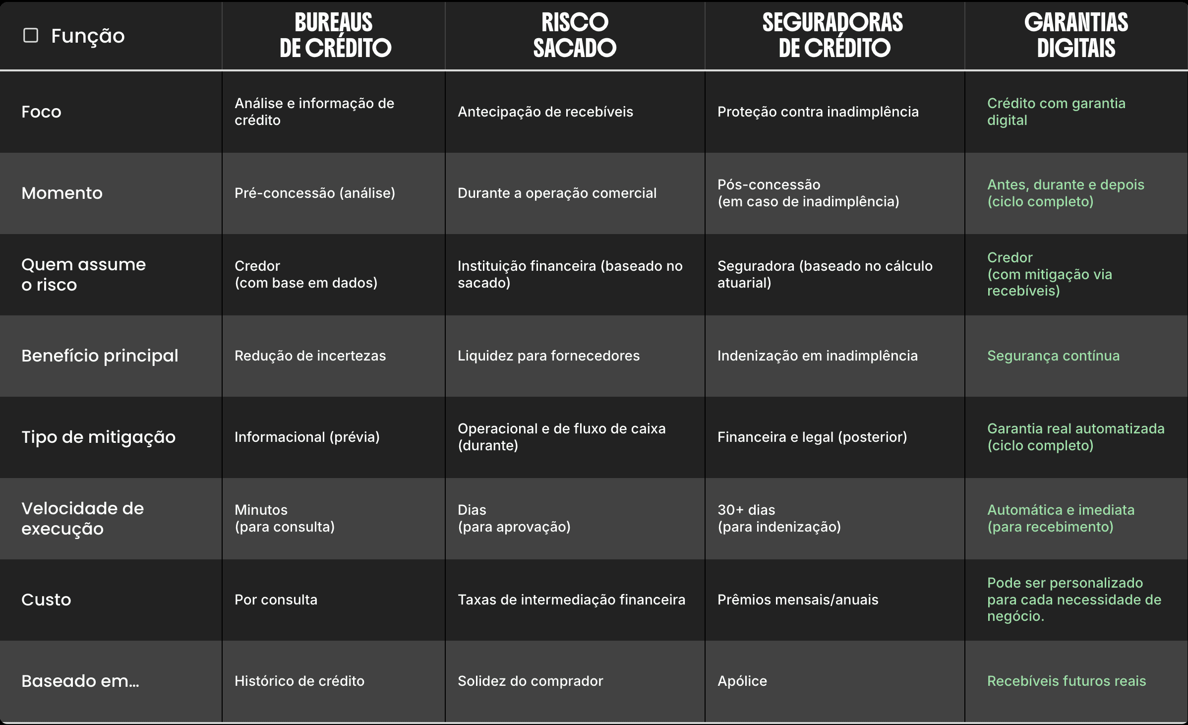 Não há nada fundamentalmente errado com bureaus, seguradoras ou operações de risco sacado. O problema está em tratá-las como soluções definitivas, quando na verdade são soluções parciais. Veja a cobertura conforme a ferramenta que apoia no ciclo do crédito.